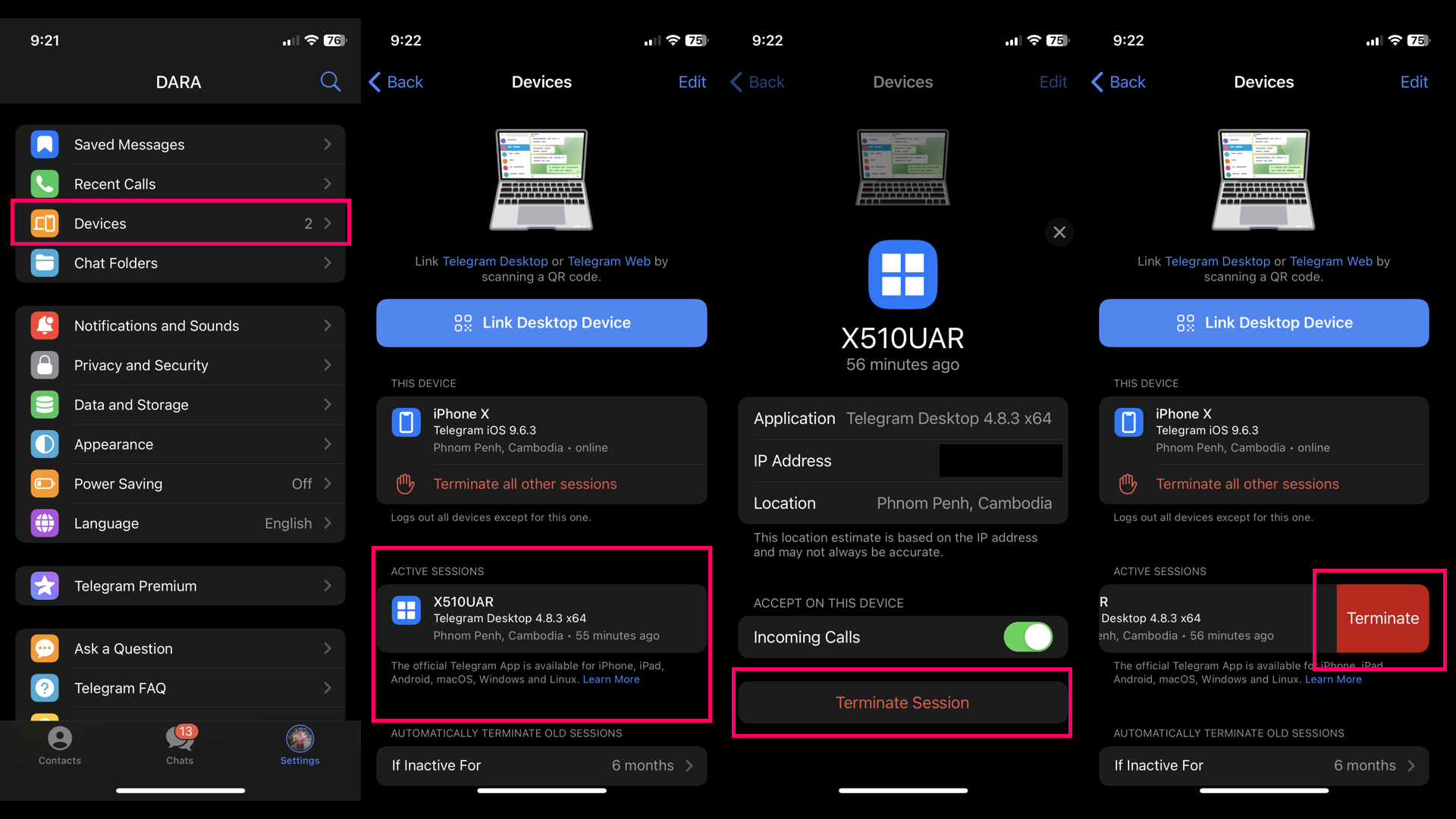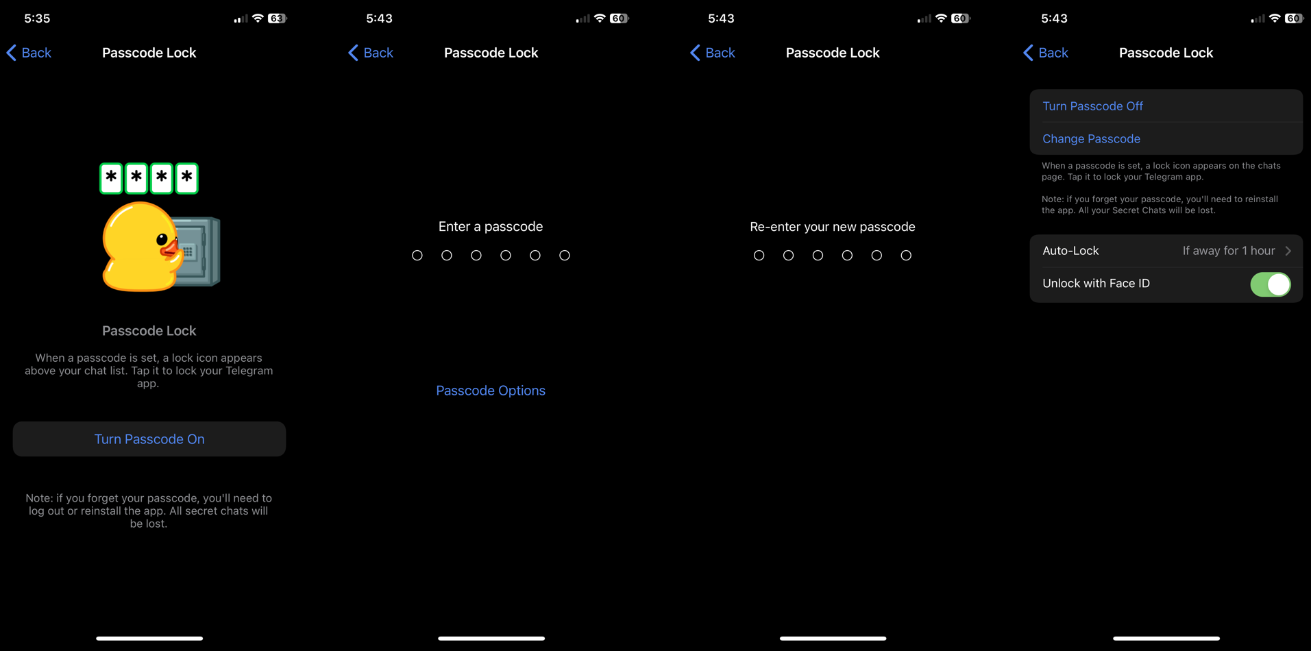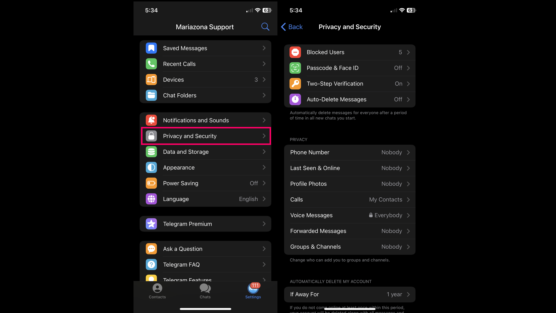 Blocked Usersគឺជាបញ្ជីនៃគណនីដែលអ្នកបានធ្វើការបង្ខាំង ឬ Block អ្នកប្រើប្រាស់ទាំងនោះ។Passcode & FaceID (IOS)/Fingerprint (Android)គឺជាមុខងារលេខកូដសម្ងាត់បន្ថែមទៅលើ Local Device របស់អ្នកមួយជាន់បន្ថែមទៀតរាល់ពេលអ្នកចេញចូលកម្មវិធី ដើម្បីការពារគណនីអ្នកពីការលួចប្រើបន្ទាប់ពីដោះសោរទូរស័ព្ទរួច។ ដូច្នេះនៅពេលដែលអ្នកបាត់ទូរស័ព្ទ ឬត្រូវគេដោះសោរទូរស័ព្ទបាន គេមិនអាចបើកតេឡេក្រាមអ្នកបានឡើយ ដរាបណាអ្នកបានបើកមុខងារមួយនេះ។ ការកំណត់គឺសាមញ្ញបំផុត គ្រាន់តែចូលវាយលេខកូដដែលអ្នកចង់ដាក់ ហើយភ្ជាប់ជាមួយនឹង FaceID ឬ Fingerprint (បើមាន) ជាការស្រេច។